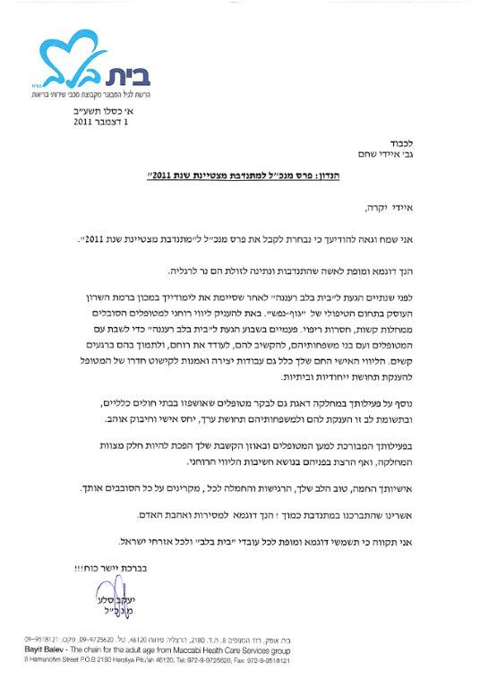 בית בלב - פרס מנכ"ל לשנת 2011 על התנדבות